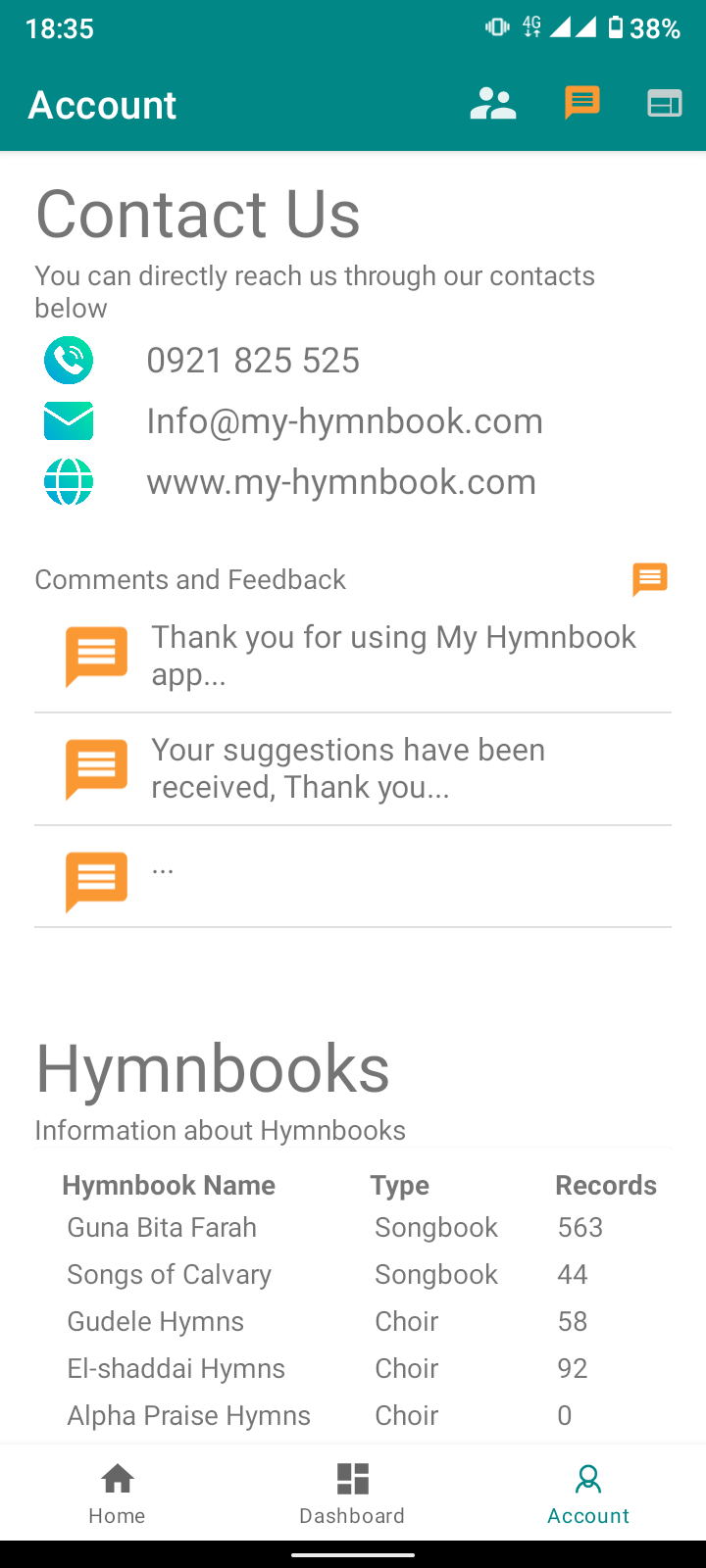 Choir members can store their songs in the hymnbook and get instant updates of new songs to be taught or sang in a particular occasion. This feature is helpful for choir members.